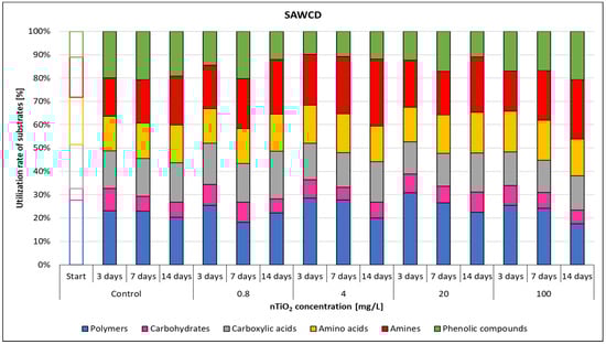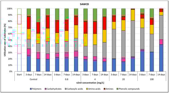 The use rates of different substrate classes (SAWCD) have rarely been applied in Biolog EcoPlate™ studies, although they can provide important and complementary information to the frequently applied endpoints. Substrates which are promptly and preferentially used may indicate important information on the environmental conditions []. Interestingly, the use of carboxylic acids showed an increasing trend over time at concentrations of 20 and 100 mg/L nZnO. The use of pyruvic acid methyl ester was the most significant within the carboxylic acid group at these nanomaterial concentrations after 14 days. The use of Tween40 and Tween80 was also significant in the microcosms containing high (20 and 100 mg/L) nZnO concentrations, while the carbohydrates were used at a much lower rate than in the control. Presumably, in this impacted environment, microorganisms acquired the ability to metabolise more complex carbon sources.