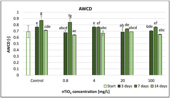Most of the computed endpoints presented a significant decrease at all examined concentrations, in some cases there were even detectable significant effects at a dosage of 0.8 mg/L. The influence of ZnO NPs was correlated with exposure time and the applied concentration; thus, at 100 mg/L dosage, the substrate use activity was highly reduced after 14 days. These results are similar to the observations of Londono et al. [], who found that nZnO had a higher influence on water bacterial community than nTiO2. In line with their results, nTiO2 did not cause significant effect at 700 µg/L, while nZnO shifted the microbial community structure and genus distribution even at 70 µg/L concentration. Similar to these results, Chavan et al. [] reported that the metabolic diversity and activity of microbial communities in soils was impacted in the presence of zinc oxide, but not of titanium dioxide NPs.
