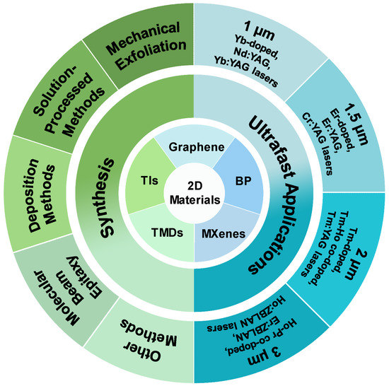 In the past decade, 2D materials have attracted wide attention in applications of ultrafast lasers due to their excellent optical and electrical properties [43,63]. In this paper, we focus on the synthesis methods and the applications of widely studied 2D materials in common wavelength of ultrafast lasers (Figure 1). The synthesis of 2D materials is generally divided into top-down and bottom-up methods. In top-down methods, bulk materials are usually exfoliated to obtain 2D materials by physical or chemical methods to overcome the van der Waals force between layers.