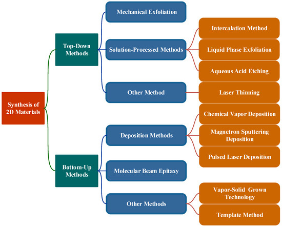 As for bottom-up methods, 2D materials are usually obtained on the substrate by deposition or growth. As shown in Figure 2, we selected the widely used methods, including ME, solution-progressing methods, deposition methods, molecular beam epitaxy (MBE), and other methods. The principles, preparation processes, characteristics, and applications of these methods are also discussed.