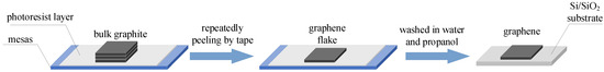In 2004, Novoselov et al. used scotch tape to repeatedly peel the graphite sheet on mesas attached to the photoresist layer and first obtained single- and few-layer graphene (Figure 3) [38]. Yin et al. peeled a single-layer molybdenum dioxide (MoS) sheet from a bulk sample and captured it onto on a Si/SiO substrate by using cellophane tape-based exfoliation. The height of the single-layer MoS obtained was ∼0.8 nm and the phototransistor made of it had good photo-responsivity [65]. ME is also widely used in the preparation of many other 2D materials. In 2010, Desalegne et al. described a method for “graphene-inspired” exfoliation of crystalline bismuth telluride (BiTe) films with a thickness of a few atoms [66].