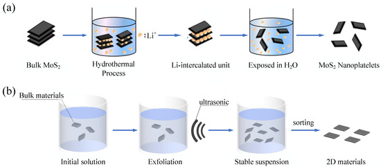 The preparation of 2D materials based on solution-processed methods. (a) Schematic of MoS fabricated by hydrothermal intercalation/exfoliation. Adapted from [47]. (b) Schematic of 2D materials fabricated by liquid phase exfoliation (LPE).