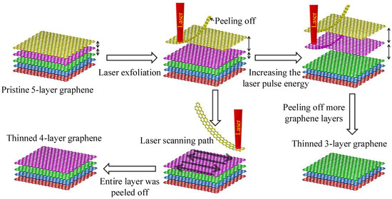 The process of laser thinning is shown in Figure 5. In 2011, Han et al. thinned the CVD-grown graphene film by laser irradiation, realized the preparation of single-layer graphene, and investigated the key parameters of the thinning effect [131]. In 2012, Castellanos-Gomez et al. deposited multi-layer MoS films on a Si/SiO substrate by ME, which was thinned by a high-power scanning laser. Finally, they reduced the multi-layer MoS into a single-layer 2D crystal at a rate of 8 m/min by laser thinning [127]. Later, in order to make the 2D materials prepared by laser thinning better used in electronic devices, precise controls of layer number and pattern have been widely studied. In 2015, Lin et al. thinned multi-layer graphene by using a picosecond laser, which obtained the required number of layers [133].