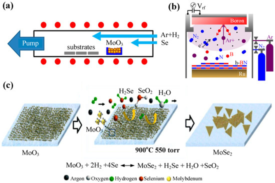 In 2013, Sutter et al. obtained high-quality and controllable thickness BN films by designing different schemes MSD of B in N/argon (Ar). As shown in Figure 6b, the collision of high-energy Ar ions with a solid B target resultd in the evaporation of B. Then, h-BN was obtained by the combination of evaporated B and dissociated N on the substrate [140]. In 2015, Ling et al. prepared MoS by MSD, and the film thickness could be controlled to 0.75 nm [151]. In the same year Tao et al. demonstrated a MSD method for synthesizing uniform MoS with controllable number of layers in a large area [152].