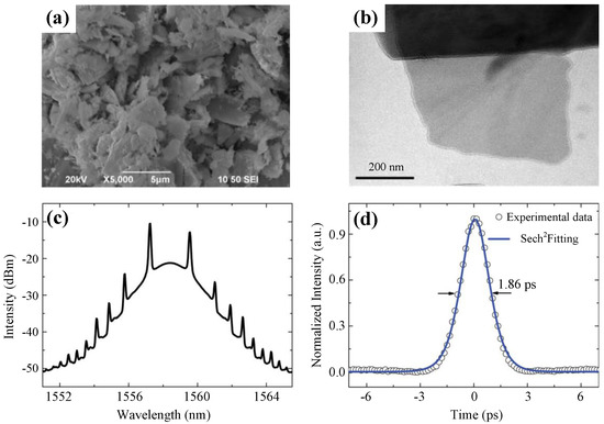 Figure 9c,d shows the spectrum centered at 1558.4 nm and the pulse width of 1.86 ps. Scanning electron microscopy (SEM) and TEM images of the as-prepared BiTe are shown in Figure 9a,b. Later, the saturable absorption property of BiSe was experimentally investigated by Zhao et al. from a mode-locked fiber laser with a tunable waveband ranging from 1557 to 1565 nm [87]. This pioneering work paved the path for applications of TIs in ultrafast photonics.