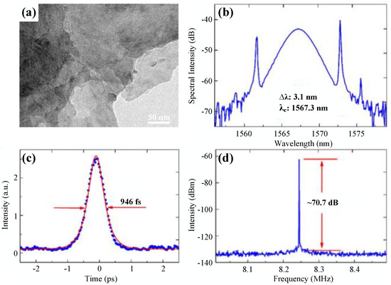 Since this pioneering work, the applications of 2D materials including graphene in ultrafast lasers started flourishing [187]. In 2010, Sun et al. proposed a broadband tunable ultrafast laser mode-locked by graphene at the central wavelengths ranging from 1525 to 1559 nm with a pulse width about 1 ps near transform limitation [188]. Such wavelength-tunable pulsed lasers enjoy great potential in various applications, such as spectroscopy and sensing [189]. Figure 8a shows the transmission electron microscope (TEM) image of the folded graphene flake. The output spectra, corresponding autocorrelation traces, and output pulse train are shown in Figure 8b–d, respectively.