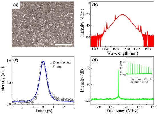 - Xia, H.; Li, H.; Lan, C.; Li, C.; Zhang, X.; Zhang, S.; Liu, Y. Ultrafast erbium-doped fiber laser mode-locked by a CVD-grown molybdenum disulfide (MoS2) saturable absorber. Opt. Express 2014, 22, 17341–17348. [Google Scholar] [CrossRef]