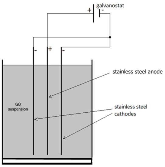 GO architecture was easily and effectively synthetized by electrophoretic deposition. In this process, 150 mg of GO powder was dispersed in 100 mL deionized water and sonicated an ultrasonic homogenizer (KRAINTEK, Podhájska, SVK) for 2 h at room temperature. SS substrate (7.4 × 4.5 cm) and acrylic glass cell were well cleaned and polished. The special pre-treatment method was used on the surface of the SS electrode. Two cleaned SS plates served as cathodes, one piece of SS in the middle served as the anode (Figure 1) and electrodes were connected to the power supply (Statron 2225, Bad Herrenalb, Germany). Other materials such as aluminum foil, copper or nickel substrate could also be used as anode material [30]. The direct current (DC) voltage of 10 V was applied between the SS substrate for 8 min during the deposition. Negatively charged GO migrated towards the positive electrode (anode) due to the influence of an electric field. Under the proper condition, particles aggregate to form the layered film that adheres to the surface of SS. After deposition, the samples were air-dried for 24 h. The process was repeated 3 times; homogenous multilayers of closely packed deposits were created. The anode was then baked for 24 h at 80 °C initially and then at 300 °C for 2 h to partially reduce the GO and improve conductivity [40].