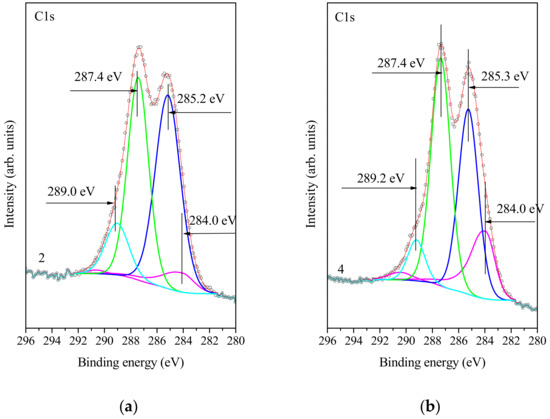 X-ray photoelectron spectroscopy (XPS) measurements have been carried out on the SPECS (SPECS GmbH, Berlin, Germany) electron spectrometer equipped with PHOIBOS 100 SCD analyzer. Base pressure in the analysis chamber was 5 × 10−10 mbar (2 × 10−8 mbar during the measurements). The measurements have been performed using the twin anode MgKα/AlKα non-monochromated X-ray source, used with excitation energies of 1253.6 and 1486.6 eV, respectively. The data were evaluated by SpecsLab2 CasaXPS software (Casa Software Ltd.). The energy scale has been calibrated by normalizing the C1s line of hydrocarbons to 285.0 eV. The processing of the measured spectra included subtraction of X-ray satellites and Shirley-type background [41]. The peak location and areas were evaluated by a symmetrical Gaussian-Lorentzian curve fitting. The relative concentrations of the different chemical species were determined after normalization of the peak areas to their photoionization cross-sections, calculated by Scofield [42].