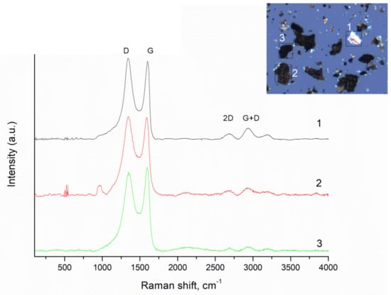 Raman spectroscopy gave information about the structural characteristics of HGO and TGO. The D (~1350 cm−1) peak position is attributed to a structural disorder like defects and/or edges in the material. The D peak corresponds to the breathing mode of κ-point phonons of A1g symmetry, while the G (~1602 cm−1) peak corresponds to the E2g phonon from the stretching of carbon sp2 atoms [46] (Figure 5). The Raman spectrum is also modified due to the disorder in the sp2 structure after oxidation of graphite powder and because of the attachment of hydroxyl and epoxide groups on the carbon structure. The stronger the D band over the G band depends on the functionalization degree of GO. The intensity ratio between these two peaks indicates the quality of the material. The 2D band (2700 cm−1) is known as the indicator of the number of graphene layers. Prepared HGO contains mostly a few layers with some defects. If you compare it with the D and G band, the peak is very small, but it may be improved by reducing the number of GO layers. For instance, there is a bold difference between curve number three (thick layer) and number one (thin layer). The S3 peak (~2921 cm−1) is a second-order peak derived from the D-G peak combination. The S3 band is observed, which confirms the presence of a disordered structure for GO. The differences among the positions of the individual bands are minimal.