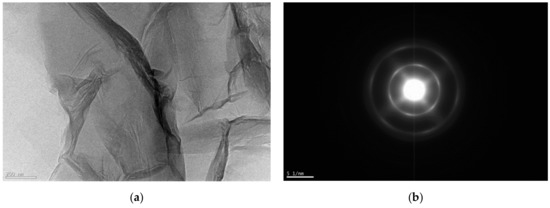 Transmission electron microscopy (TEM) images of two samples support the assertion that TGO has a more regular structure than HGO (Figure 7 and Figure 8). All procedures produce large flakes of GO which are a few layers thick, but the electron diffraction patterns indicate the crystallinity differences. The TGO is highly oxidized; however, it possesses the pointed electron diffraction pattern and more carbon framework. Darker areas indicate the thicker nanostructure of several GO layers. The higher transparency areas indicate the thinner composition of GO layers due to the stacking of exfoliated nanostructure. Delaminated graphene layers are shown by the TGO sample.