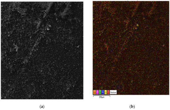 The deposition is thicker with the third application of the GO layers as it is shown in Figure 11b. The same conditions were used for all depositions. Obviously, the film deposited on both sides of the electrode that was submerged in the liquid. The outlines of GO sheets were visible (SEM micrographs, Figure 12). The structure of GO was highly wrinkled. The void spaces that were visible with one deposition (Figure 12a) disappeared with three depositions of GO and the thicker and more homogeneous surface was observed (Figure 12b). The results of the scanning electron microscopy (SEM) and energy dispersive X-ray detector (EDX) analyses of the GO deposited on SS with the elemental mapping are given in Figure 13a,b. These results are in good agreement with the results of the TEM analysis.