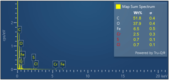 The detailed GO morphology and chemical composition of elements are shown in Figure 15 and Figure 16. The analyzed samples show these homogenous multilayered structures of GO. EDX maps are given in Figure 16 carbon and oxygen are detected on the surface of samples and also iron and chromium were found on the surface with the light pattern due to the layer of GO.