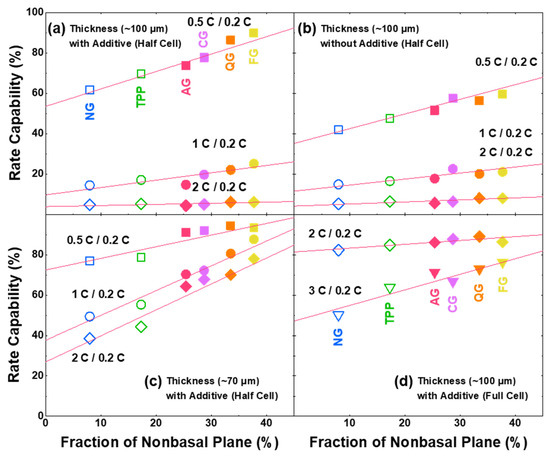 Correlations between fraction of non-basal plane and fast-charging capability with coin cells. Half-cell conditions: (a) ~100-μm thick electrode with electrolyte additive, (b) ~100-μm thickness without electrolyte additive, and (c) ~70-μm thickness with electrolyte additive. (d) Full-cell condition: ~100-μm thick graphite electrode with electrolyte additive and LiNi0.88Co0.10Al0.02O2 (NCA) cathode.