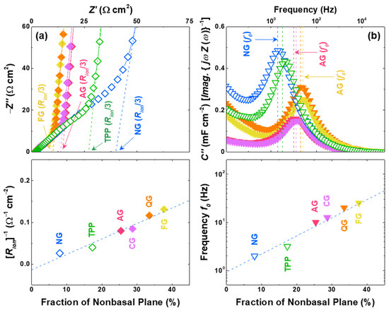 Kinetic properties of graphite symmetric electrodes. (a) Impedance spectra at the pristine state (before lithiation) where the intercept at the x-axis indicates ionic resistance (Rion/3) in a porous electrode (top). Dependence of the fraction of non-basal planes on the inverse of the ionic resistance (Rion)−1 (bottom). (b) Imaginary part of complex capacitance (top) where the dashed line indicates the frequency for the maximum value (f0). Dependence of the fraction of non-basal planes on the Li-ion response frequency (f0) (bottom).