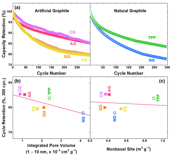 Since the voltage of electrolyte decomposition occurs in the operation voltage of the graphite, cycle performance can be drastically reduced, as continuous decomposition occurs unless stable SEI is formed on the graphite surface [51,52,53,54,55,56]. Recent studies have reported that irreversible capacity increases linearly with non-basal planes, and the exposed pores in graphite promote SEI formation [22,57,58,59]. In this study, we have additionally examined how non-basal sites affect the cycle life of graphite anodes as well as the pore volume [22]. In order to investigate the correlation between the pore/non-basal sites and cyclability, constant-current charge/discharge cycling tests of these graphites with an NCA cathode (Figure 5) were conducted. The retained specific capacity of full cells at 300 cycles is lower with more pore/non-basal sites. We have also confirmed the cycle life with the pore volume of 1–10 nm in diameter, and the negative linear relationship of the cyclability according to the pore volume was more pronounced than the tendency according to the non-basal site (Figure 5b,c). The BJH method assumes that the pores are cylindrical, but since it is also applied to slit-shaped pores, pores of 1–10 nm appearing in graphite can be considered as defective sites, such as steps or surface roughness [32,33,34]. The pore distributions of graphite samples are shown in Figure S6, and it can be shown that the non-basal sites are not perfectly proportional to the pore volume (Figure S6c). This can be attributed to the volumetric difference of the non-basal constituents, as the edge plane occupies a high portion of non-basal sites, and the nature of defects are more pronounced in the pores with high curvature.