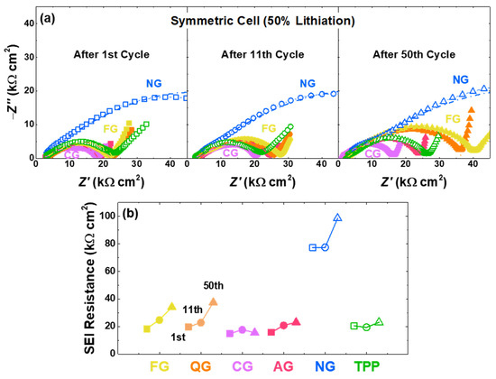 Impedance analyses using symmetric cells were performed to compare the SEI formation of six different graphites with 50% lithiation after the 1st, 11th, and 50th cycles (Figure 6a,b). The frequencies of semi-circle regions are over 100 Hz, indicating the resistance region attributed to the SEI [22,60,61,62,63]. Although there are differences among the samples, the SEI resistance generally increases as the cycle progresses. For instance, the buildup in the 50th-SEI resistance is significantly larger than the 1st and 11th cycles, indicating the cell degradation. As cycles progress, the degradation accelerates, and the SEI resistance increases as more SEI layers become formed from the previously formed SEI [60,61,62,63]. Such catalyzed degradation looks more pronounced with a higher content of non-basal sites and pores, which means that the SEI formation can occur continuously at the pore and non-basal sites (Figure S7).
