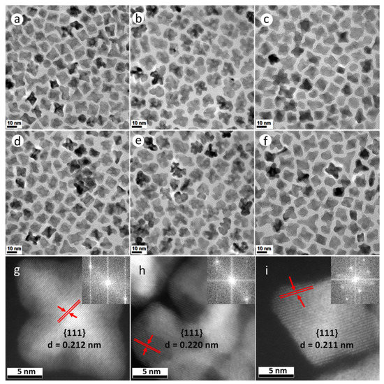 Both PtNi and Pt(NiCo) NPs (Figure 1a,c,d,f and Supplementary Figure S1) exhibit four distinct morphologies (confirmed by assessments of populations of 400 NPs): 6-fold concave star-shaped (40% of PtNi and 36% of Pt(NiCo) NPs), 4-fold octahedral (35% of PtNi and 40% of Pt(NiCo)), 3-fold octapodal (10% of PtNi and 14% of Pt(NiCo)) and 6-fold tripodal (15% of PtNi and 10% of Pt(NiCo)) axes of symmetry. These structures were predominantly enclosed by {110} and {111} crystal planes, suggesting that crystal growth of the PtNi and Pt(NiCo) NPs occurred predominantly along <110> and <111> directions. This oriented growth further suggests that the {111} and {110} vertexes and edges served as foundations for selective adatom deposition [27,28]. In contrast, TEM analysis of PtCo NPs showed the formation of asymmetrically curved surface structures (Figure 1b,e and Supplementary Figure S1), suggesting restriction of the faceted morphologies seen in the PtNi and Pt(NiCo) NPs. We associate the PtCo NP morphology with the chemical reduction behaviour of the Co(Ac)2 precursor, with this large molecule preventing, due to steric hindrance, the formation of a faceted geometry [8]. The faceted morphology of Pt(NiCo) NPs, formed with the same Co precursor, suggests that PtNi nuclei formed rapidly and established a faceted morphology before Co incorporation during growth of the ternary NPs. The highly symmetric crystal growth of these PtNi and Pt(NiCo) NP populations may be attributed to preferential passivation/chemisorption of cosurfactants (OAm and HDA) on the least densely-packed {110} and most densely-packed {111} facets, contributing to unequal adatom growth rates/patterns on weakly passivated crystallographic planes. The use of binary surfactants thus allows growth rate differences between distinct crystal facets, producing mixtures of NP geometries with varying degrees of concavity. Atomic resolution high-angle annular dark field scanning transmission electron microscopy (HAADF-STEM) images (Figure 1g–i) of these alloy nanostructures reveal the crystalline lattice structures with a high degree of crystallinity, while continuous parallel and clearly-resolved lattice fringes indicate that the particles are perfect single crystals. The measured interplanar spacings (d) and the dominant facets are also indicated. Insets in Figure 1g–i are fast Fourier transforms (FFTs) which confirm that these alloy NPs are face centered cubic (FCC) single crystals despite their varying concavities. The bright regions covering the outer NP surface are associated with Pt-enrichment, while compositional inhomogeneity is evident across the individual alloy NPs.
