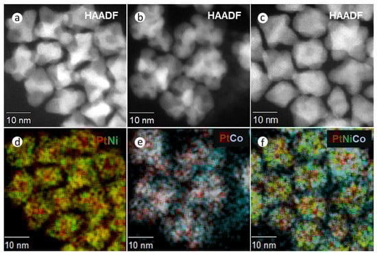 To confirm the incorporation of solutes in these alloy NPs, elemental distribution was measured by STEM x-ray mapping (Figure 2 and Supplementary Figure S4). These figures show HAADF-STEM images and composite EDX spectroscopic mapping for PtNi (Figure 2a,d), PtCo (Figure 2b,e), and Pt(NiCo) (Figure 2c,f). All the NPs show compositional variations within the particles, i.e., an inhomogeneous solute-solvent distribution, with uneven bright regions (in the HAADF images) being characteristic of higher Pt concentrations, segregated to {111} surfaces. The darker regions were correspondingly enriched in both Ni and Co. These observations are consistent with the previous reports on inhomogeneous compositional variations [1,31,32]. The chemical composition of NPs was determined from STEM-EDS and the bulk elemental composition by ICP-OES; no consistent change in composition during the synthesis procedure was observed. Quantification (Supplementary Figure S4a–c) of the metal contents using the Cliff Lorimer ratio method and the K Factors supplied by the Noran software, showed mean elemental ratios of Pt54Ni46, Pt48Co52 and Pt50(Ni26Co24) (insets in EDS spectra, Supplementary Figure S4a–c). Supplementary Table S1 summarizes the particle sizes, crystallite domain sizes, and chemical compositions of these NPs at various synthesis times (15, 30, 45, 60 min). The average particle size of 250–300 PtNi, PtCo, and Pt(NiCo) NPs of extracted samples were measured from TEM micrographs of regions chosen at random and also from crystallite domain sizes estimated from PXRD data using the Debye–Scherrer equation.