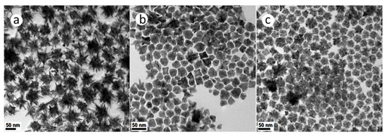 High temperature thermolytic decomposition (i.e., without the use of reductants), was carried out using synthesis method (b). In this solution-phase synthetic approach, both temperature and the surfactants served to induce the reduction of metal precursors. Synthesis Method (b)(i) resulted in PtNi NPs with complex, hyperbranched structures as shown in Figure 4a. Both PtCo and Pt(NiCo) NPs (Figure 4b,c) showed the coexistence of asymmetrically-shaped (~90% Pt(NiCo) and ~95% PtCo) and dendritic (~10% Pt(NiCo) and ~5% PtCo NPs. The recorded PXRD patterns of these alloy types revealed fcc solid solution phases (Supplementary Figure S9).
