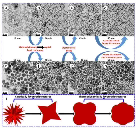 Our synthesis reaction times were initially shortened to 15 min as black products rapidly precipitated out of the bulk organic reaction medium, suggesting the formation of dense NPs and thus intrinsic colloidal instability. Based on the observation of high surface area PtNi and Pt(NiCo) polymorphs, we extended the reaction time to investigate the possibility of geometric reshaping or Ostwald ripening phenomena of these two-alloy systems. The ripening duration was extended to 60 min with aliquot samples extracted from the synthesis media after every 15 min. We observed dramatic morphological transformations from dendritic to near spherical surface structures with extended aging periods (Figure 5a–h). These reconstructive transformations/changes are attributed to minimization of NP total interfacial free energy [28,35,36,37]. TEM analysis reveals the evolution of dendritic structures in both systems, with the Pt(NiCo) alloy yielding more well-defined, high surface-area hyperbranched morphologies bounded by low surface energy {111} facets within the first 15 min of reaction (Figure 5g). However, both the PtNi and Pt(NiCo) systems show significant NP reshaping after 30 min (Figure 5b,f). The PtNi NPs evolved into dense irregular or near-spherical, convex and concave (monopods, bipods to tripods) shapes, with complete smoothing/dissolution of dendritic structures. After 45–60 min, the sample contained mostly spherical and random irregular shapes (Figure 5c,g). The Pt(NiCo) system displayed significant structural changes transitioning to intermediate geometries of cubes with concave surfaces on the major {100} crystal facets. These morphologies showed insignificant changes after a dwell time of 45 min. At 60 min, these alloy NPs morphed to near-spherical polydisperse morphologies (Figure 5d,h). These time-dependent ripening processes reveal that the NP surface reconstructions/transformations could arise due to the instability of the high-energy facets, particularly the rounding of the vertexes [38]. Furthermore, weakened/destabilized binding strength of colloidal stabilizers (surfactants) on the NPs at this dwell temperature (240 °C) may have permitted their morphological reshaping. In all cases, the development of dense and compact near-spherical NPs arises from the disappearance of high surface-area hyperbranched structures while most of the diverse anisotropic geometries evolved from the smaller colloids. In our studies, the results garnered from both PtNi and Pt(NiCo) NP systems clearly demonstrate that prolonged ripening periods promoted substantial geometric or reconstructive transformations of alloy colloids from kinetically (high energy surface) to thermodynamically favourable (low energy surface) morphologies [37,38], as shown in Figure 5i.
