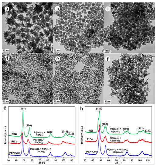 Under the same thermolytic conditions, the metal sources Ni(Ac)2 and Co(Ac)2 were replaced with Ni(acac)2 and Co(acac)2. TEM images showed the coexistence of alloy NP morphologies ranging from spherical, monopods, bipods, tripods, tetrapods to high surface-area dendritic structures (Figure 5a,b). Previous studies have shown that various single-crystalline and multi-crystalline structures with varying degrees of branch formation can coexist within the same synthesis media [37,39]. These diverse branched structures were observed to be more dominant in both PtNi and Pt(NiCo) NP populations (Figure 5b) than the asymmetrical morphologies of PtCo NPs with corroded surfaces (Supplementary Figure S10a). We observed a light blue solution during destabilization-purification of PtCo alloys using dry ethanol (as an antisolvent), suggesting the dissolution of cobalt (II) oxide (CoO). The formation of structures with multiple voids through the nanoscale Kirkendall-type effect [2,40,41,42,43], due to oxidized Co and its subsequent disintegration from the bulk PtCo system during the NP purification process, is an unusual phenomenon. Although TEM analysis revealed diverse NP morphologies, PXRD lines showed the crystalline nature of these three alloy types to be fcc solid solution phases. The PtCo diffraction peaks shifted towards lower 2θ values as a result of substantially dissolved Co/Co oxides (Supplementary Figure S10b). Stripping the surface-coordinating agents (stabilizers) from the crystal surfaces might have promoted the oxidation of Co atoms, consequently making them prone to disintegration from the PtCo nanostructure.