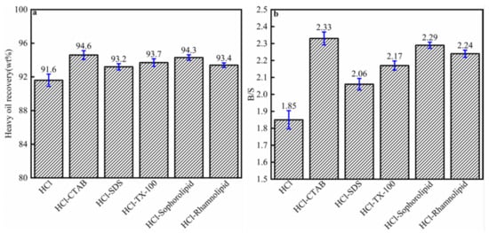 (a) Recovery; (b) B/S of heavy oil from different surfactants enhanced carbonate oil–solid separation.