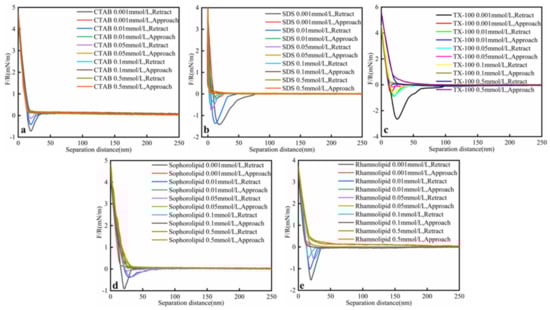 Interaction forces (F/R) between bitumen and calcium carbonate in different concentrations of surfactants solution as a function of separation distance was shown in Figure 5. Five surfactants could effectively decrease heavy oil–solid adhesive force (Table 4). When the CTAB concentration was 0.001 mmol/L, the oil–solid adhesive force was 0.72 mN/m. When CTAB concentration increased, the oil–solid adhesive force decreased. The SDS decrease oil–solid adhesive force effect was weaker than CTAB. When SDS concentration was 0.001 mmol/L, the oil–solid adhesive force was 1.41 mN/m. When SDS concentration increased to 0.5 mmol/L, the oil–solid adhesive force decreased to 0. When TX-100 concentration was 0.001 mmol/L, the adhesive force was 2.64 mN/m, which means that the TX-100 effect on oil–solid adhesive force was weak on low concentration. Biosurfactants (sophorolipid, rhamnolipid) could effectively decrease oil–solid adhesive force. When sophorolipid and rhamnolipid concentration was 0.1mmol/L, the oil–solid adhesive force was 0.1 mN/m, 0.48 mN/m, respectively. The oil–solid adhesive force decreased when the surfactants concentration increased. When the surfactants’ concentration was 0.5 mmol/L, the oil–solid adhesive force decreased to 0 (TX-100 except). When the surfactants’ concentration was 0.001 mmol/L, the adhesive force was as follows: CTAB <sophorolipid < SDS < rhamnolipid < TX-100; When the surfactants’ concentration was 0.05 mmol/L, the adhesive force was as follows: CTAB < sophorolipid < rhamnolipid < SDS < TX-100. The oil–solid adhesive force altered when the surfactants’ concentration altered. When the oil–solid adhesive force decreased, the heavy oil recovery and B/S increased.