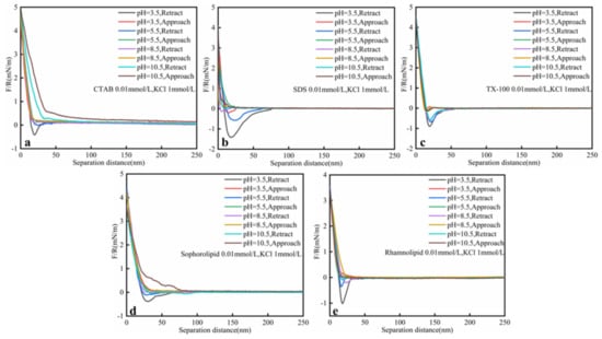 As shown in the Figure 6 and Table 5, heavy oil–solid interaction force decreased with higher pH. The surfactants’ adsorption onto oil–solid interface would increase when pH increased. Hot-water-based extraction (HWBE) was done at higher pH due to the lower oil–solid interaction force. 0.01 mmol/L surfactants make the oil–solid adhesive force followed the rules: CTAB < sophorolipid<rhamnolipid < TX-100 < SDS (at higher pH, SDS < TX-100). When the pH was 10.5, CTAB, SDS and sophorolipid decreased the oil–solid adhesive force to 0.