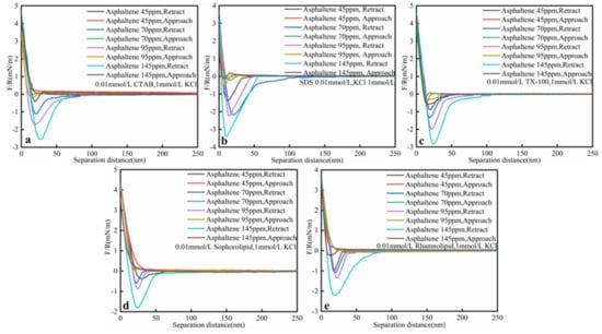 As was shown in Figure 7 and Table 6, oil–solid interaction force increased with higher asphaltenes concentration. Asphaltenes are the most complex component among SARA. When the asphaltenes content increased, the heavy oil viscosity increased, and then oil–solid separation became more difficult. When asphaltene concentration was 45 ppm, the oil–solid adhesive force followed the rule: sophorolipid (0.39 mN/m) < CTAB (0.42 mN/m) < TX-100 (0.89 mN/m) < rhamnolipid (1.02 mN/m) < SDS (1.36 mN/m). When asphaltene concentration increased to 145 ppm, the oil–solid adhesive force followed the rule: sophorolipid (1.80 mN/m) < rhamnolipid (2.21 mN/m) < CTAB (2.56 mN/m) < TX-100 (2.84 mN/m) < SDS (3.39 mN/m). At low asphaltenes concentration, the rhamnolipid effect was not so obvious. When the asphaltenes concentration increased, the rhamnolipid could effectively decreased the oil–solid interaction force. In other words, rhamnolipid showed optimal effect in decreasing oil/solid interaction force at higher asphaltenes concentrations.