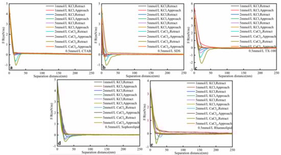 As was shown in Figure 8 and Table 7, salinity would influence oil–solid interaction force in surfactant solutions. When salinities increased, oil–solid interaction force increased. At the same salinity, Ca2+ could make oil–solid interaction force higher than K+, which was due to the fact that Ca2+ could help oil–solid form bridge connection effect. For instance, when CaCl2 concentration was 5 mmol/L, the oil–solid interaction force for CTAB, SDS, TX-100, sophorolipid, rhamnolipid was 1.03, 1.05, 2.10, 0.58, and 0.76 mN/m, respectively. However, when KCl concentration was 5 mmol/L, the oil–solid interaction force for CTAB, SDS, TX-100, sophorolipid, rhamnolipid was 0.04, 0.22, 0.70, 0.36, and 0.26 mN/m, respectively. Compared to chemical surfactants (CTAB, SDS, TX-100), biosurfactants (sophorolipid, rhamnolipid) showed higher salt resistance. When CaCl2 concentration reached 2 mmol/L, the oil–solid interaction force in biosurfactants was lower than that in chemical surfactants. In industrial production, biosurfactants should be chosen in industrial saline.