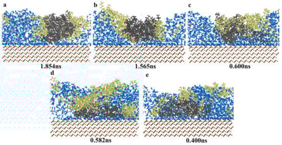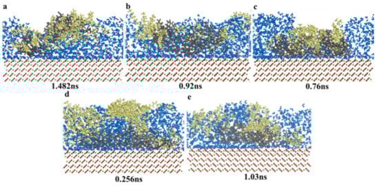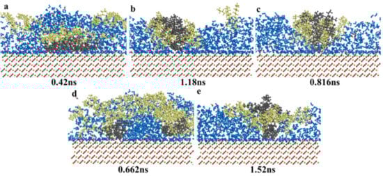 Although surfactants have been widely used in the EOR process, the mechanisms of surfactants’ enhanced oil recovery are unclear. On the one hand, some researches indicated that surfactants could adsorb onto minerals surface, and they occupy the heavy oil components adsorption sites, and then heavy oil components would liberate from minerals surface []. On the other hand, some studies have indicated that surfactant molecules could adsorb the oil components surface, and then the surfactant molecules would “tow” heavy oil components liberation from minerals surface [,]. In this study, we used the molecular dynamics to explore the surfactants’ behavior on the oil–solid interface and oil-water interface, which could explain the enhancement mechanism.