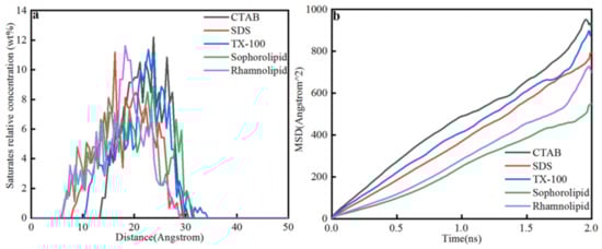 Figure 9 showed that the total liberation time of five surfactants was as follows: CTAB (0.42 ns) < sophorolipid (0.662 ns) < TX-100 (0.816 ns) < SDS (1.18 ns) < rhamnolipid (1.52 ns). CTAB showed the strongest interaction with saturates molecules because of the shortest total liberation time. For the biosurfactants, sophorolipid molecules role was obviously stronger than rhamnolipid.