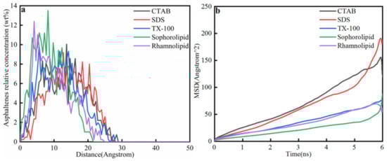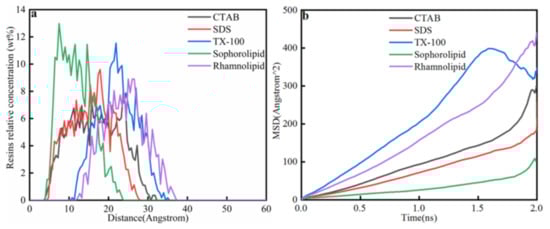 Figure 15a showed the asphaltene concentration after 6 ns molecular dynamic simulation. After 6 ns molecular dynamic simulation, the asphaltenes would not totally liberate from calcite surface, and the displacement of asphaltenes in five different surfactants: CTAB (29 Å) > TX-100 (28 Å) ≥ SDS (27.5 Å)>Rhamnolipid (25 Å) > Sophorolipid (21.5 Å). The displacement of asphaltenes in chemical surfactants was higher than that in biosurfactants.