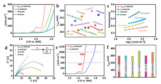 LSV curves of NF-based electrodes tested in 1.0 M KOH (a). Comparing the overpotential of Er0.4 Fe-MOF/NF at 100 mA cm−2 with other literatures (b). Tafel slopes (c) and EIS (d) of Ni foam, Fe-MOF/NF, commercial RuO2 and Er0.4 Fe-MOF/NF. LSV curves (e) and OER performance comparison histogram (f).