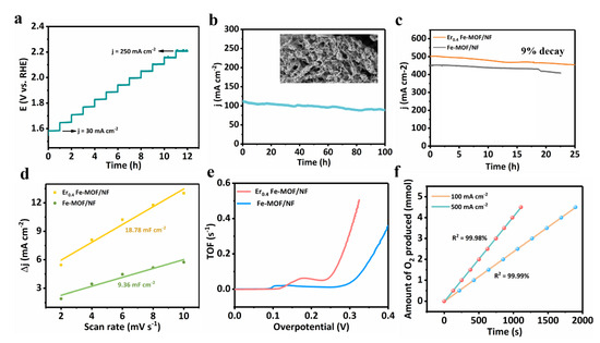 The multi-current process curve of Er0.4 Fe-MOF/NF (a) obtained at current densities of 30–250 mA cm−2, every 3600 s, respectively. Chronoamperometric (i-t) curves at current densities of 100 mA cm−2 (b), inset was the SEM image after testing. Chronoamperometric curves of Er0.4 Fe-MOF/NF and Fe-MOF/NF (c). ECSA evolutions (d) and TOF values (e) of Er0.4 Fe-MOF/NF and Fe-MOF/NF. Experimental amounts of O2 generated by the Er0.4 Fe-MOF/NF electrode at 100 and 500 mA cm−2 (f).