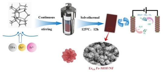 All chemical regents used in this work were analytically pure. Nickel foam (NF, area: 2 cm × 3 cm) was bought from Shenzhen Green and Creative Environmental Science and Technology Co., Ltd (Shenzhen, China). Ferric nitrate nonahydrate (Fe(NO3)3·9H2O), erbium (III) nitrate hexahydrate (Er(NO3)3·6H2O; Aladdin), terephthalic acid (C8H6O4, TPA; Aladdin), hydrochloric acid (HCl; Aladdin), N, N-dimethylformamide (DMF; Beijing Chemical Industry Group Co., Ltd, Beijing China), ethanol, and deionized water were used.