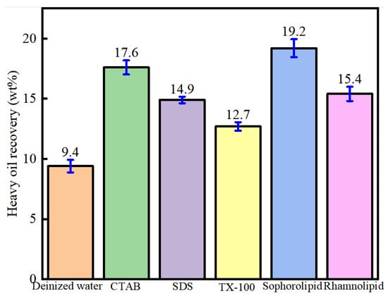 As shown in Figure 4, application of the five surfactants could effectively enhance heavy-oil–solid separation, and the oil recovery followed the order of sophorolipid (19.2 wt%) > CTAB (17.6 wt%) > rhamnolipid (15.4 wt%) > SDS (14.9 wt%) > TX-100 (12.7 wt%) > deionized water (9.4 wt%). Different surfactants had different effects on the enhancement of heavy-oil–solid separation, which was due to the fact that different surfactant molecules showed different effects on oil–water interface modification and oil–solid interface modification.
