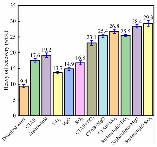 Figure 5 shows that treatment with the 0.1 wt% γ-Al2O3, MgO, TiO2, ZrO2, and SiO2 nanoparticles showed an obvious effect in increasing heavy oil recovery. Compared to the deionized water without any nanoparticles, 0.1 wt% SiO2 nanofluid increased the heavy oil recovery from 9.4 to 16.8 wt%. MgO, TiO2, γ-Al2O3, and ZrO2 could increase heavy oil recovery to 14.9, 13.7, 11.4, and 10.7 wt%, respectively. The addition of nanofluids could effectively enhance heavy oil recovery, which was due to the fact that nanofluids could effectively alter the oil/water interface and the carbonate mineral surface. The different nanofluids had different effects on oil recovery, and different nanoparticles showed different characteristics on mineral surface adsorption, oil/water interface properties, and oil/solid interface modification.