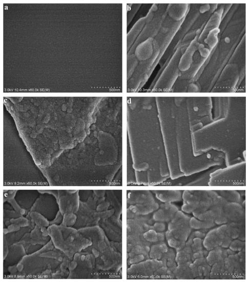 SEM images of (a) unmodified oil-wet calcite and of oil-wet calcite modified with (b) CTAB, (c) SDS, (d) TX-100, (e) rhamnolipid, and (f) sophorolipid.