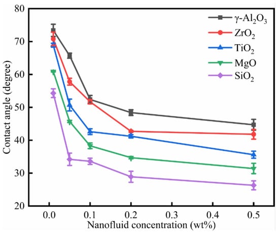 As shown in Figure 15, the oil-wet calcite surface became more hydrophilic when the nanofluid concentration was increased. When the concentration of nanofluid was increased, its adsorption on the mineral surface increased, and the calcite surface became gradually covered by nanoparticles. When the nanofluid concentration was 0.1 wt%, the nanofluid adsorption level reached saturation. When the nanofluid concentration reached 0.2 wt%, the contact angle gradually stabilized. In consideration of the nanofluids’ cost and the economic benefits, 0.1 wt% was determined as the optimal concentration. For the same given concentration, the decrease in water contact angle on the oil-wet calcite surface was according to the following order: γ-Al2O3 > ZrO2 > TiO2 > MgO > SiO2. As shown in Figure 11, the roughness measurements of the oil-wet calcite surfaces treated by SiO2, MgO, ZrO2, TiO2, and γ-Al2O3 nanofluids were 113.1, 45.1, 121.5, 21.7, and 37.33 nm, respectively. The roughness influenced the surface wettability, and higher roughness was beneficial to water-wet surfaces, but the influence was only one-sided. Figure 10 shows that the coverage of nanoparticles influenced the mineral surface wettability, and a higher coverage of nanoparticles was beneficial to water-wet surfaces. Besides surface roughness and nanoparticles coverage, the nanoparticle adsorption properties and surface energy influenced mineral wettability. SiO2 nanoparticles showed optimal adsorption [36] and thus had an optimal effect on the oil-wet calcite wettability.