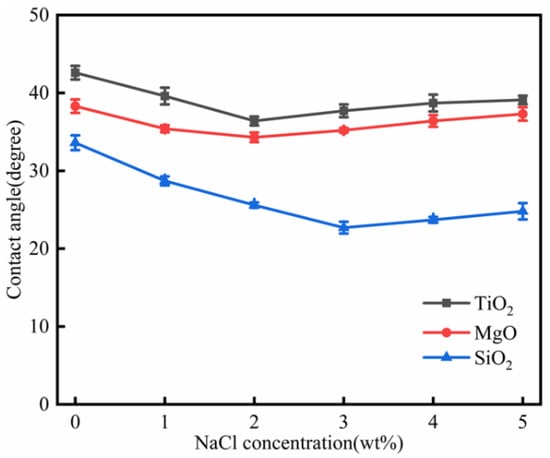 The effect of TiO2, MgO, and SiO2 nanofluids on the oil-wet calcite wettability at different salinities is shown in Figure 17. When the nanofluid concentration did not reach the optimal concentration, the contact angle decreased with higher salinity. However, when the salinity increased further, the contact angle increased. For different nanofluids, the optimal salinity was different. The optimal salinity for SiO2, TiO2, and MgO nanofluids was 3, 2, and 2 wt%, respectively. The nanofluids remained stable at low salinity; however, the nanofluids became unstable when the salinity increased [40], because higher salinity results in compression of the electric double layers, which increased the adsorption rate of nanoparticles. Therefore, when the salinity was lower than the optimal level, the contact angle decreased due to nanofluid instability. However, when the salinity reached the optimal level, the contact angle increased slightly, due to adsorption of Na+ onto the oil-wet calcite surface [41], and its occupation of adsorption sites further increases nanoparticle adsorption. Therefore, the contact angle would increase further [42].