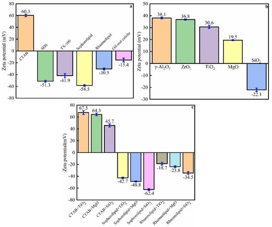The zeta potential of the surfactants, nanofluids, and surfactant–nanofluid hybrid solutions is shown in Figure 19. The zeta potential of 500 ppm CTAB, SDS, TX-100, sophorolipid, and rhamnolipid was 60.3, −51.3, −41.9, −58.5, and −30.5 mV, respectively. The oil-wet calcite had a negative charge, and its zeta potential was −15.4 mV due to the fact that bitumen has a negative charge. The zeta potential of 0.1 wt% γ-Al2O3, ZrO2, TiO2, MgO, and SiO2 nanofluids was 38.1, 36.8, 30.6, 19.5, and −22.1 mV, respectively. When the nanofluids and surfactants were combined together, the zeta potential values were similar to those of the surfactants. The surfactants adsorbed onto the nanoparticle surface, so the zeta potential was nearly the same as that of the surfactants. If the zeta potential of the surfactants and nanofluids had opposing charges, the surfactant–nanofluid hybrid solution zeta potential would decrease.