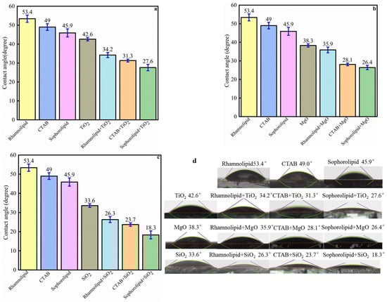 Synergistic effect of nanofluids and surfactants on oil-wet calcite wettability: (a) TiO2 and surfactants; (b) MgO and surfactants; (c) SiO2 and surfactants; (d) measurement figure.