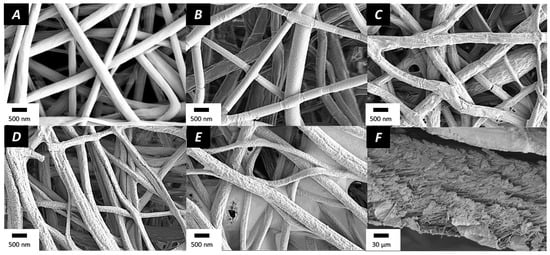 SEM pictures of (A) PLGA nanofibers, (B) plasma-coated nanofibers, (C) (CHI/ALG)5, (D) (CHI/ALG)9, (E) (CHI/ALG)15, and (F) cross-section of (CHI/ALG)15 layers.