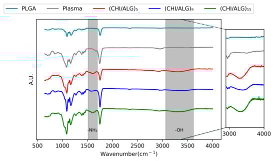 AT-FTIR of PLGA, plasma-coated, (CHI/ALG)5, (CHI/ALG)9, and (CHI/ALG)15 electrospun nanofibers. The inset highlights the differences between the peaks in the 3000–4000 cm−1 region corresponding to the alcohol function present on both alginate and chitosan polymeric backbones. The region from 1550 to 1650 cm−1 describes the apparition of the amino function present in the chitosan polymeric backbone.