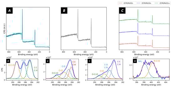 XPS survey scans of (A) PLGA, (B) plasma-coated PLGA, (C) (CHI/ALG)5, (CHI/ALG)9, and (CHI/ALG)15. The latter demonstrates a succesful deposition of chitosan due to the apparition of the typical peaks at 396–404 eV, depicting the presence of nitrogen onto the surface of the meshes. The region scans for (D) C1s of PLGA, (E) C1s of plasma-coated PLGA, and (F) C(1s) of (CHI/ALG)5 show the chemical changes on the surface throughout the different steps of the coating. The region scan for (G) N1s of (CHI/ALG)5 was used as an example of the nitrogen peak appearing after the deposition of chitosan.