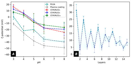 Surface zeta potential of (A) PLGA, plasma coated, (CHI/ALG)5, (CHI/ALG)9, (CHI/ALG)15, and (B) of the layer deposition process at pH 3.