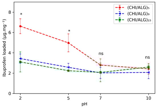 Amount of drug loaded onto the meshes pHs after 15 m of immersion in a saturated solution of IBU at pH 2.0, 5.0, 7.0, and 10.0. Statistical significance between (CHI/ALG)5 and (CHI/ALG)9 or (CHI/ALG)15 is highlighted with a * and non-significant differences between amounts are indicated with text (ns).