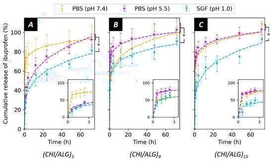 Drug release in PBS (pH 7.4), PBS adjusted to pH 5.5 and SGF (pH 1) from (A) (CHI/ALG)5, (B) (CHI/ALG)9, and (C) (CHI/ALG)15. The release rates were fitted using the Ritger–Peppas (power law) model. Statistical significance is indicated with * when comparing the release PBS (pH 7.4) and PBS (pH 5.0) with the release in SGF(pH 1.0).